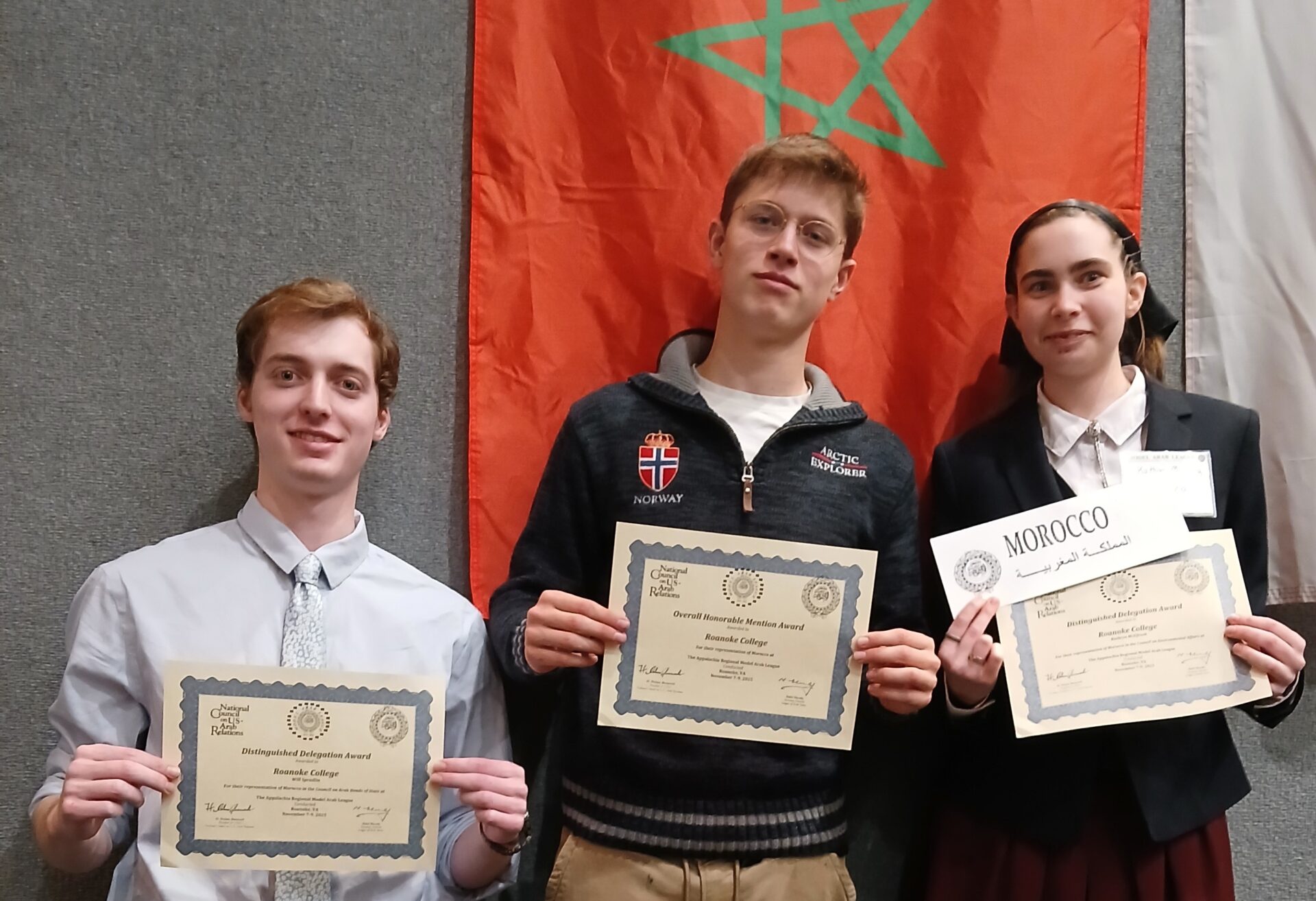 The delegation of Morocco consisted of Kathryn McElfresh ‘26 on the Environmental Affairs Council, Bram Jan van Dijk on the Political Affairs Council, and Will Spradlin ‘26 on the Summit of Arab Heads of State. They did so well overall that they won an honorable mention award – which is Model Arab League terminology for second place – as a whole for their representation of Morocco across these councils.